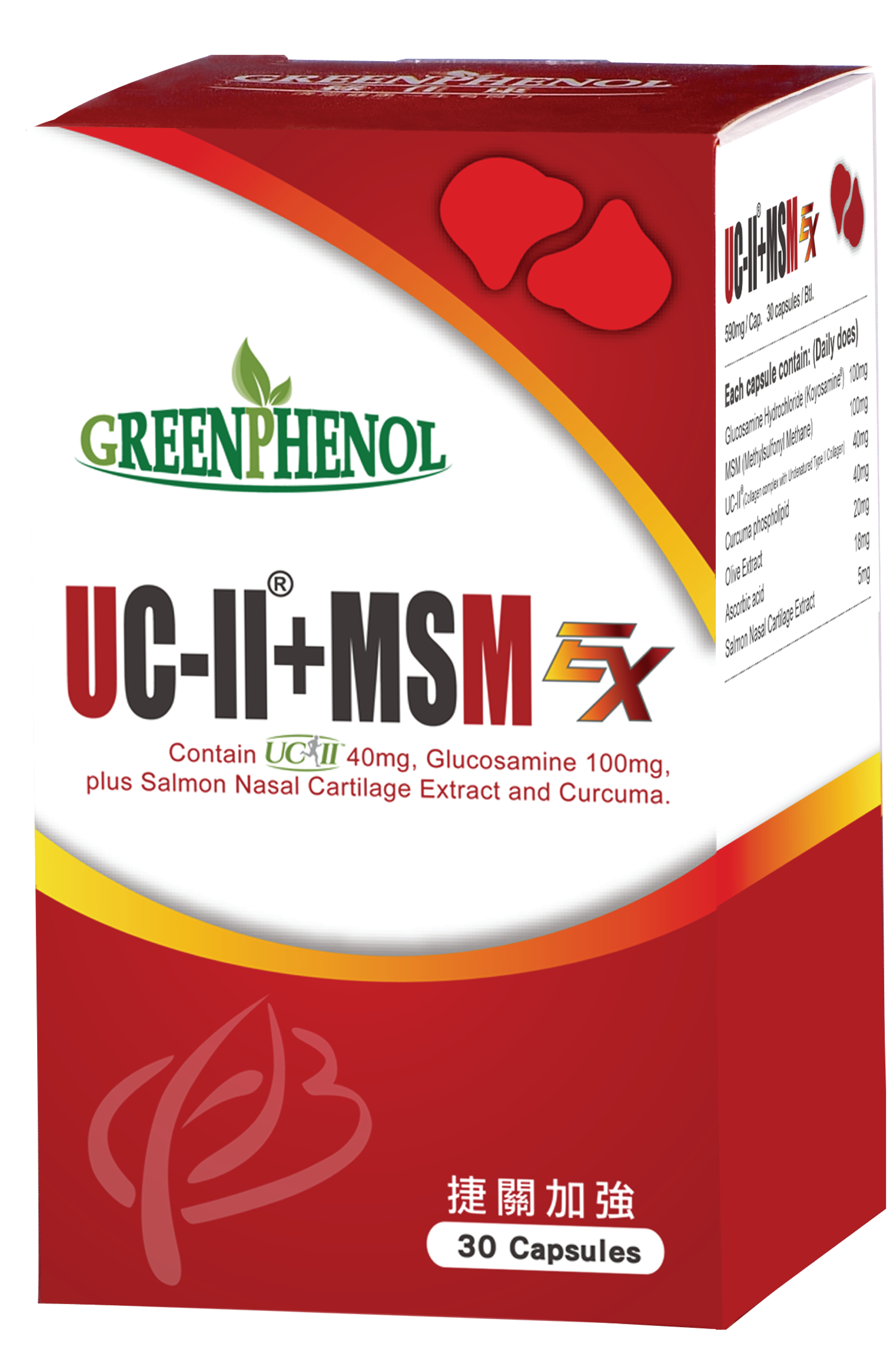 主成分(每日劑量):UC-II 40mg/葡萄糖胺鹽酸鹽100mg/甲基硫醯甲烷(MSM)100mg /鯊魚軟骨素300mg/橄欖果萃取物20mg